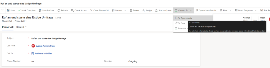 Abschluss: Nach dem Gespräch kannst du die Aktivität als Mark Complete schließen oder bei Erfolg direkt in eine Opportunity umwandeln.