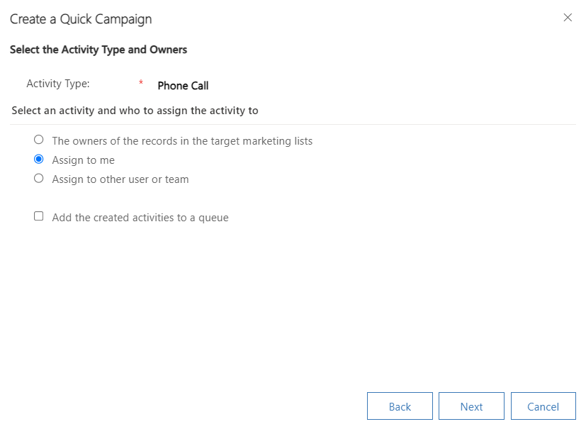 Assistent folgen: Wähle „Phone Call“ als Aktivitätstyp aus und weise die Aufgaben dir selbst oder deinem Team zu.