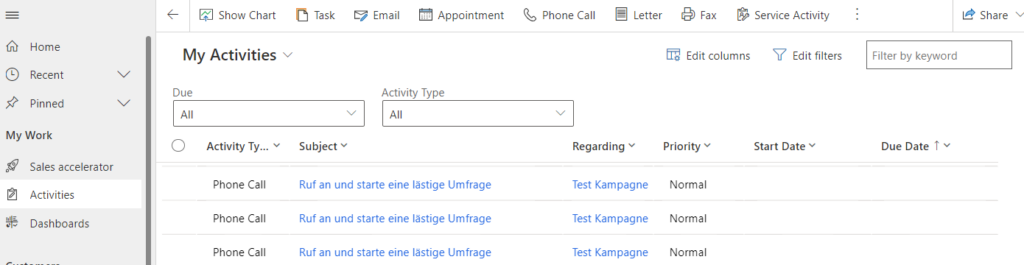Zentrale Ansicht: Unter Activities (Aktivitäten) kannst du die geplanten Anrufe einzeln aufrufen.
